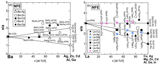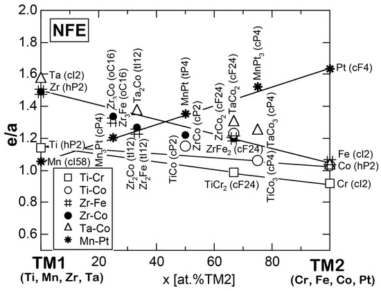 - Sato, H.; Inukai, M.; Zijlstra, E.S.; Mizutani, U. NFE approximation for the e/a determination for 3d-transition metal elements and their intermetallic compounds with Al and Zn. Philos. Mag. 2013, 93, 3029–3061. [Google Scholar] [CrossRef]