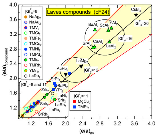 All the data points fall onto a universal line (e/a)compound = (e/a)av with the accuracy of ±20%. This assures us of the validity of the linear interpolation rule, as frequently discussed throughout the present article. Now researchers are allowed to estimate e/a value for any compounds simply by taking a composition average of e/a listed in Table 1 with the accuracy of ±10% in most cases or ±20% in worse cases. For example, the data for Mg3P2 (cI80) are positioned at (e/a)compound = 2.45 and (e/a)av = 3.2 well below the line with the deviation of approximately −20% in Figure 107. As discussed in Section 6.3.3, a large discrepancy in e/a for Mg3P2 (cI80) was attributed to the difficulty in constructing a reliable NFE curve due to two relatively wide energy gaps shown in Figure 75b. We consider such situations to occur but to be rather exceptional.
