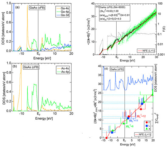 (a) Ga- and (b) As-pDOSs, (c) Hume-Rothery plot and (d) FLAPW-Fourier spectra at symmetry points Γ, L, and X of the fcc Brillouin zone along with the total DOS for GaAs (cF8). See captions to Figure 19 (b) for symbols in (c) [37].