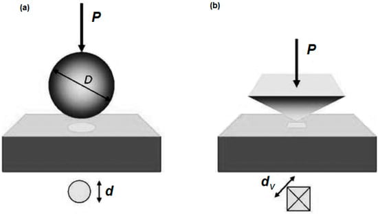 Indentation tests were first performed by a Swedish iron mill’s technical manager Brinell who used spherical balls from hardened steel ball bearings or made of cemented tungsten carbide as indenters to measure the plastic properties of materials in 1900 [1,2,3,4]. Brinell’s testing approach is schematically shown in Figure 1a. Brinell also proposed the following formula to determine the hardness