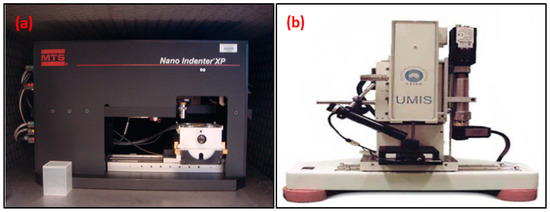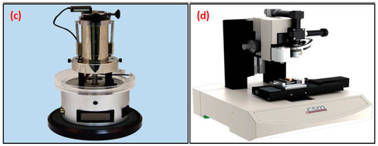 Figure 2. Commercial representative indentation instruments: (a) Nano-Indenter XP (Keysight Technologies); (b) Ultra-Micro-Indentation System (IBIS); (c) TS-75-TriboScope (Hysitron); (d) Table-Topnanoindentation (Anton Paar).