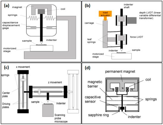 The most famous manufacturers of nanoindentation equipment include Keysight Technologies (Santa Rosa, CA, USA), Micro Materials Ltd. (Wrexham, UK), Fischer-Cripps Laboratories Pty Ltd. (Killarney Heights, Australia), Hysitron Inc. (Eden Prairie, MN, USA), and Anton Paar (Ashland, VA, USA). The iconic products of these manufacturers are shown in Figure 2. The working theories of different representative instruments are given in Figure 3. All of these instruments include three principal parts, namely indenter, load application, and capacitive sensor for measuring the displacements of the indenter. For instance, in Figure 3a, the load is applied by an electromagnetic coil which is connected to the indenter shaft by a series of leaf springs. The deflection of the springs is a measure of the load applied to the indenter, and the displacement usually can be measured by a capacitive sensor.