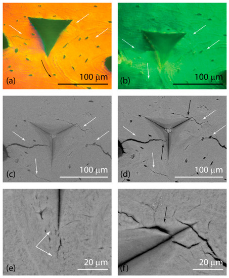 Figure 5. Indentation site on the transverse section of human cortical bone. Images are of (a) as-indented; (b) dehydrated; (c) ESEM (environmental scanning electron microscope) and (d) SEM. The bottom corner of the indentation; (e) shows a crack with 1 = 10 μm, which is one of the two cracks emanated from indent corners among 30 corners. High-magnification imaging of the top right corner; (f) revealed that no cracks were generated from this indent corner [21]. Reproduced with permission from J.J. Kruzic et al., Journal of the Mechanical Behavior of Biomedical Materials; published by Elsevier, 2009.