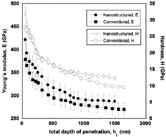 Application of nanoindentation tests to determine the mechanical properties of surface coatings is another milestone. Normally, the investigations of the mechanical properties of the coatings are difficult as the traditional compression and tensile tests are unable to apply well at very small scales. Rodriguez et al. [27] performed depth sensing indentation in plasma sprayed Al2O3–13% TiO2 nano-coatings in order to determine the Young’s modulus and hardness. It was found the mechanical properties were dramatically enhanced in the nanostructured coating compared to the conventional one, which is shown in Figure 7. Swain, Menčík and their coworkers [28,29] investigated the application of five approximation functions (linear, exponential, reciprocal exponential, Gao’s, and the Doerner and Nix functions) for determining the Elastic modulus of thin homogeneous films. By conducting various experimental testes, they found that generally the Gao analytical function is able to predict the indentation response of film/substrate composites. For determining the thin film modulus from experimental data, satisfactory results can also be obtained with the exponential function, while linear function can only be used for thick films where the relative depths of penetration are small. For determing the hardness of thin films, Jönsson and Hogmark [30] built a physical model which was verified for chromium films on four different substrate materials.