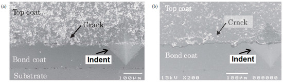 Figure 10. Typical interfacial cracks initiated by the indentation test: (a) for 0 thermal cycles (As-sprayed); (b) after 500 cycles [39]. Reproduced with permission from S. Kuga et al., Procedia Engineering; published by Elsevier, 2011.