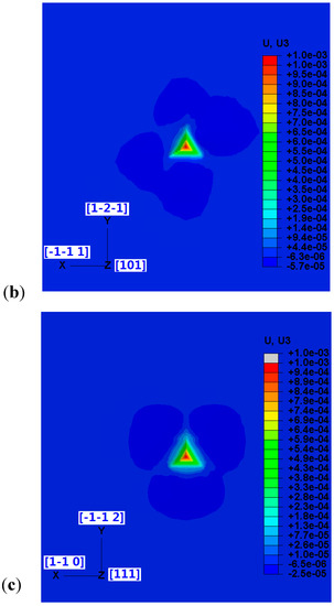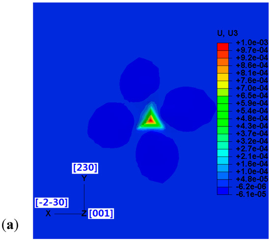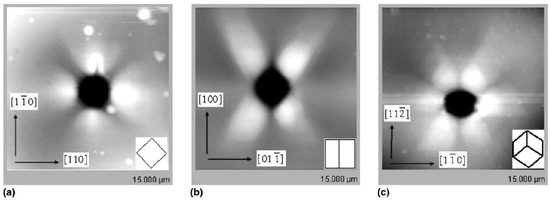 The dependence of nanoindentation piling-up patterns and of micro-textures on the crystallographic orientation was studied by Wang et al. [40] using high purity copper single crystal with three different initial orientations. The indentation tests were performed on a Hysitron nanoindentation setup using a conical indenter to avoid symmetries. The results are shown in Figure 11. Four-, two-, and sixfold symmetrical piling-up patterns were captured on the surface of (001), (011) and (111) initial oriented single crystal, individually, which could be explained in terms of the strong crystallographic anisotropy of the out-of-plane displacements around the indenter.