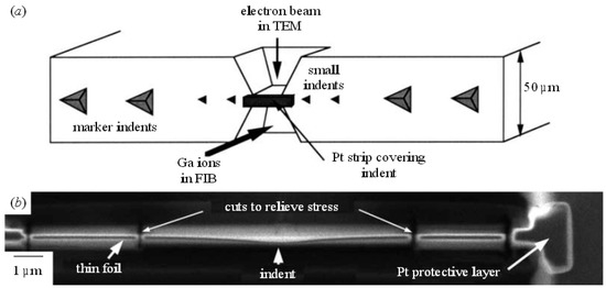 Figure 12. (a) Schematic illustrating how the indents were sectioned in the FIB to allow examination with a TEM; (b) Secondary electron FIB image of the final stages of preparation of a thin foil through a 50 mN indent in silicon [42]. Reproduced with permission from S.J. Lloyd et al., Proceedings of the Royal Society A; published by The Royal Society, 2005.