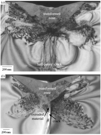 Figure 13. Bright field images of indents in silicon formed with loads of (a) 30 mN and (b) 60 mN. The structure is observed here after the load has been removed, allowing the high-pressure phase to transform back to a mixture of other structures [43]. Reproduced with permission from S.J. Lloyd et al., Philosophical Magazine A; published by Taylor & Francis, 2002.