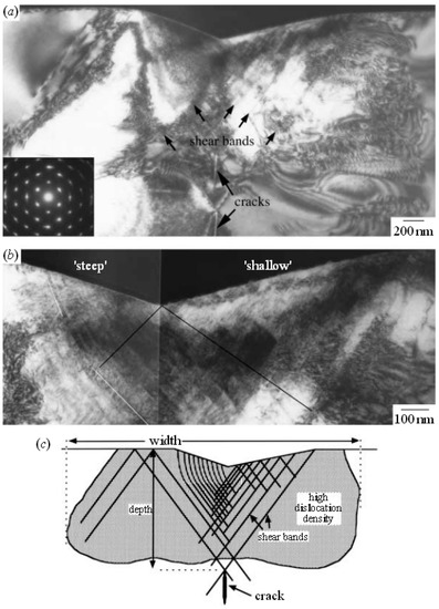 Figure 14. (a) Bright field image of an 80 mN indent in spinel with an inset diffraction pattern; (b) Bright field image of a 60 mN indent in spinel showing the region of shear bands under the indent more clearly; (c) Schematic illustrating the principle components of the deformation pattern in spinel [42]. Reproduced with permission from S.J. Lloyd et al., Proceedings of the Royal Society A; published by The Royal Society, 2005.