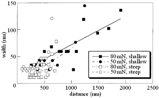 Figure 15. Slip band spacing in spinel as a function of distance from the indenter tip (see Figure 14b) for the 50 mN and 80 mN indents. The error in measurement of the shear band spacing is approximately 10 nm [42]. Reproduced with permission from S.J. Lloyd et al., Proceedings of the Royal Society A; published by The Royal Society, 2005.