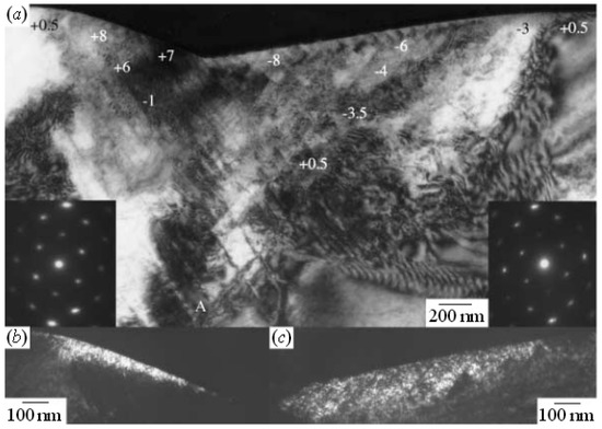 Figure 16. (a) Bright field image of a 50 mN indent in spinel with lattice rotations (in degrees) at selected positions indicated; (b,c) are dark field images of the surface of the same indent taken using streaks from either side of the 004 reflection [42]. Reproduced with permission from S.J. Lloyd et al., Proceedings of the Royal Society A; published by The Royal Society, 2005.
