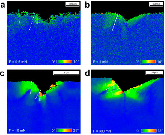 Lattice rotation angles around an axis perpendicular to the [110] zone axis were investigated [42] and are shown in Figure 16. It was found the rotations only occurred in the region immediately below the indent impression. The greatest rotations were quite near the indent tip and the magnitude of rotation angles decreased significantly with the increasing distance from the indent tip along the surface on the shallow side.