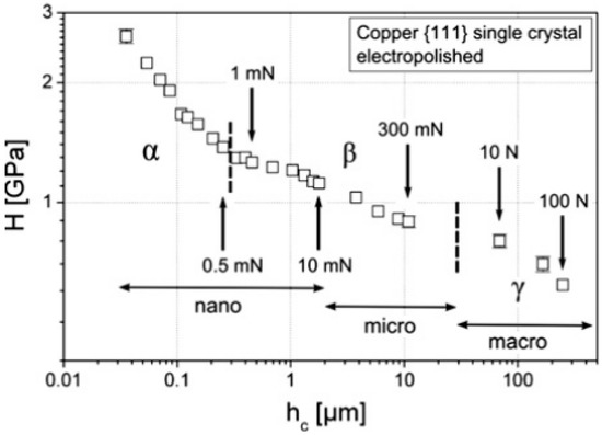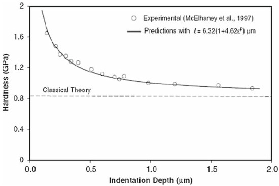 Figure 22. Visualization of the ISE: hardness decreases with increasing indentation depth for cold-worked polycrystalline copper [62]. Reproduced with permission from G.Z. Voyiadjis et al., Acta Mechanica; published by Springer, 2010.