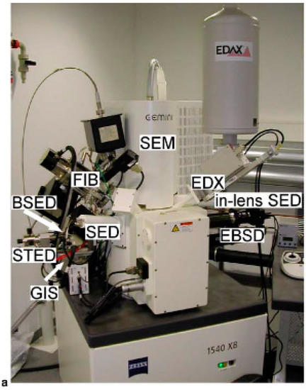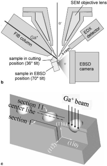 Zaafarani et al. [45] investigated texture and microstructure below a conical nano-indent in a (111) oriented Cu single crystal using 3D EBSD. The tests were performed using a joint high-resolution field emission scanning electron microscopy/electron backscatter diffraction (EBSD) set-up coupled with serial sectioning in a focused ion beam system in the form of a cross-beam 3D crystal orientation microscope (3D EBSD) as shown in Figure 19.
