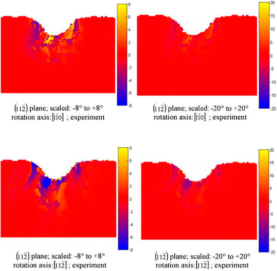 The EBSD tests conducted in sets of subsequent ( 11 2 ¯ ) cross-section planes exhibited a pronounced deformation-induced 3D patterning of the lattice rotations below and around the indent, which are shown in Figure 20.