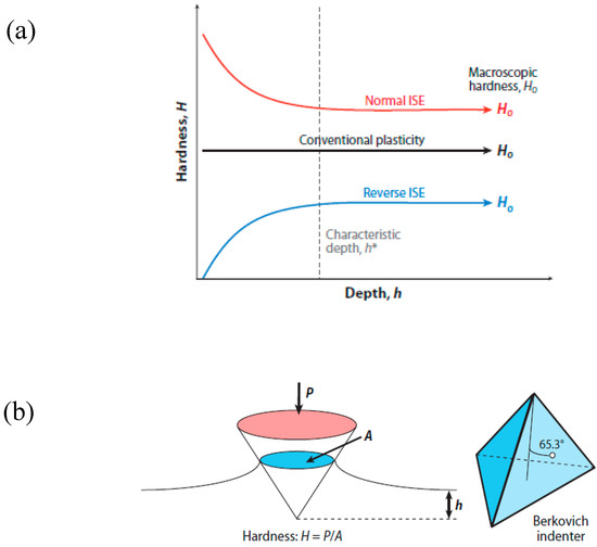 Figure 21. Indentation size effect (ISE) (a) for geometrically self-similar indenters such as a conical or pyramidal tip (b) [46]. Reproduced with permission from George M. Pharr et al., Proceedings of Annual Review of Materials Research; published by Annual Reviews, 2010.