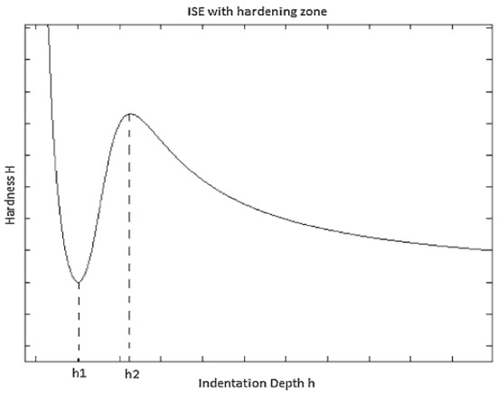 Figure 23. Visualization of the ISE with the incorporated hardening effect. For h < h1, hardness decreases, for h1 < h < h2, hardness increases and for h > h2, hardness decreases again [62]. Reproduced with permission from G.Z. Voyiadjis et al., Acta Mechanica; published by Springer, 2010.