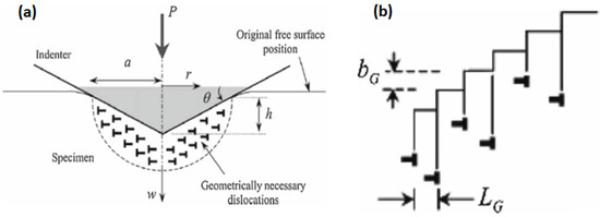 The most famous strain gradient plasticity model for nanoindentation was proposed by Nix and Gao [65] in 1998. It has been assumed that plastic deformation of the surface is accompanied by the generation of dislocation loops below the surface, which are contained in an approximately hemispherical volume below the region in contact, as shown schematically in Figure 24. The deformation is self-similar and the angle (θ) between the conical indentation tip and indented surface remains constant.