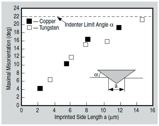 Figure 25. Maximum misorientation angle measured along the flanks of the indent for different sized Vickers indents into fcc copper (closed squares) and bcc tungsten (open squares) [82,83]. Reproduced with permission from D. Kiener et al., JOM; published by Springer, 2009.