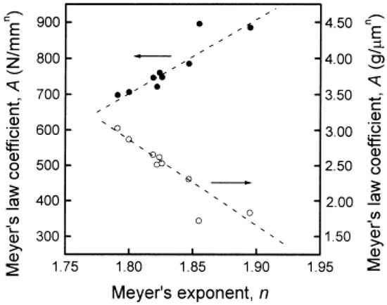 here P is the applied load; C is a constant of proportionality; the exponent n is the well-known Meyer index and d is the diameter of the residual area of the impression after unloading. When the n-value is less than 2, according to Equations (2) and (4), the hardness increases with decreasing the load. While the n-value is larger than 2, the hardness decreases with decreasing the load. If the Meyer index equals to 2, the hardness is a constant, namely load-independent. For most metals that can be work hardened by the indentation process, n > 2 [7]. Therefore, the Meyer index has been found to be strongly dependent on the work hardening of the tested material and to be independent of the size of the ball indenter [5]. Meyer [5] also found that the same hardness using balls of different diameters could be obtained only if the indentations were geometrically similar, namely with the same ratio d/D.