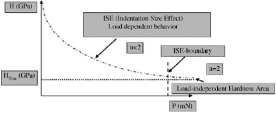 The indentation size effect (ISE) is often observed for materials that are indented with geometrically self-similar indenters like pyramidal or conical tips (see Figure 21) [46]. In general, the hardness, H, defined as the load on the indenter normalized with the projected contact area of the hardness impression (see Figure 21), should be independent of the depth of penetration, h. However, over the past 60 years, it was observed that there were significant variations of hardness with respect to penetration depth, especially when the depths decreased to less than a few micro-meters [54,55,56,57,58,59,60]. In addition, two types of indentation size effects have been reported. One is the normal ISE (the tip is pyramidal or conical)—the hardness increases with decreasing penetration depths, according to the expression “smaller is stronger” (see Figure 21). Another one is the reverse ISE (the tip is spherical) [55,56,61], which displayed that the hardness decreases with increasing depths. However, for the reverse ISE, it was observed that the hardness also increases with the decreasing of tip radius. The reverse ISE is thought to be derived from testing artefacts such as vibration in the testing system or problems with accurate imaging and measuring the sizes of hardness impressions at dimensions approaching the limits of optical microscopy [46].