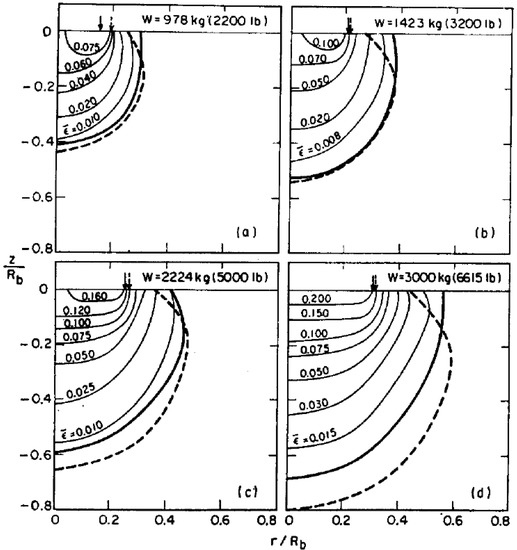 Figure 28. Strain contours and elastic-plastic boundaries under the load of (a) 978 kg; (b) 1423 kg; (c) 2224 kg and (d) 3000 kg (—FEM; ----experiment) [83]. Reproduced with permission from C.H. Lee et al., International Journal of Mechanical Sciences; published by Elsevier, 1972.