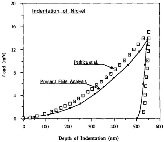 Figure 29. Comparison between the results from the present Finite Element Method (FEM) analysis and those from Pethica et al. [106] on indentation of nickel [104]. Reproduced with permission from A.K. Bhattacharya et al., International Journal of Solids and Structures; published by Elsevier, 1988.