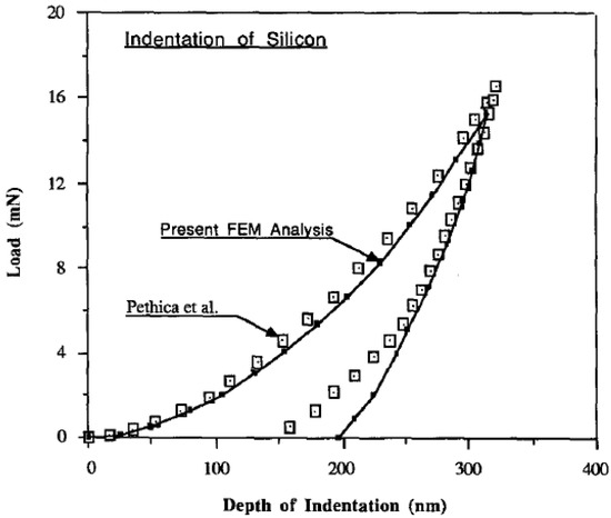 Figure 30. Comparison between the results from the present FEM analysis and those from Pethica et al. [106] on indentation of silicon [104]. Reproduced with permission from A.K. Bhattacharya et al., International Journal of Solids and Structures; published by Elsevier, 1988.