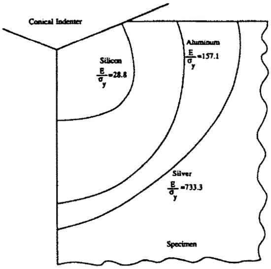 Figure 31. Comparison of the yield zones at a particular indenter angle of 136° for various E/ σ y , ratios for a depth of indentation of 203 nm [105]. Reproduced with permission from A.K. Bhattacharya et al., International Journal of Solids and Structures; published by Elsevier, 1991.