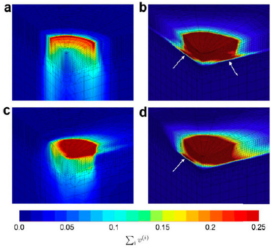 Figure 33. Details of the indentation-induced plastic zone in the simulations concerning hexagonal closest-packed (HCP) zinc crystals. (a,c) correspond to the basal and prismatic indented planes of bulk crystals. (b,d) correspond to their thin film counterparts. White arrows point to the specific locations where high plastic strain localization occurs within the coating-substrate interface. Penetration depth in the figures is h s = 3.5 µm [128]. Reproduced with permission from O. Casals et al., Computational Materials Science; published by Elsevier, 2009.