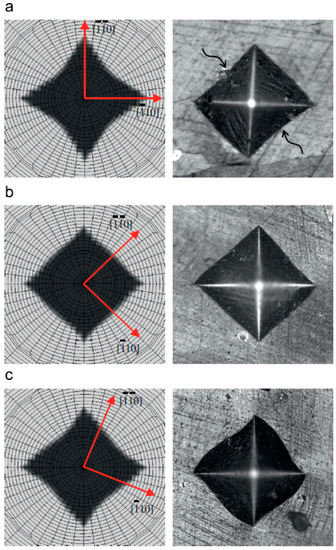 Figure 34. Imprint morphologies for Vickers indentation in the (001) plane for different orientations (rotations) of the tip. (a) The slip directions at the surface coincide with the edges of the indenter (arrows indicate development of pincushion effects); (b) The slip directions coincide with the sides of the indenter; (c) Intermediate orientation to those described in (a,b) [130]. Reproduced with permission from J. Alcala et al., Journal of the Mechanics and Physics of Solids; published by Elsevier, 2008.