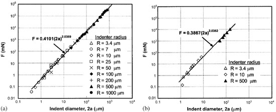 Figure 35. (a) Results of FEM simulations showing the variation of the indentation force, F with indent diameter, 2a for different indenter radii, R; (b) Results of indentation experiments showing the variation of the indentation force, F with indent diameter, 2a for different indenter radii, R [131]. Reproduced with permission from Y. Liu et al., Journal of the Mechanics and Physics of Solids; published by Elsevier, 2005.