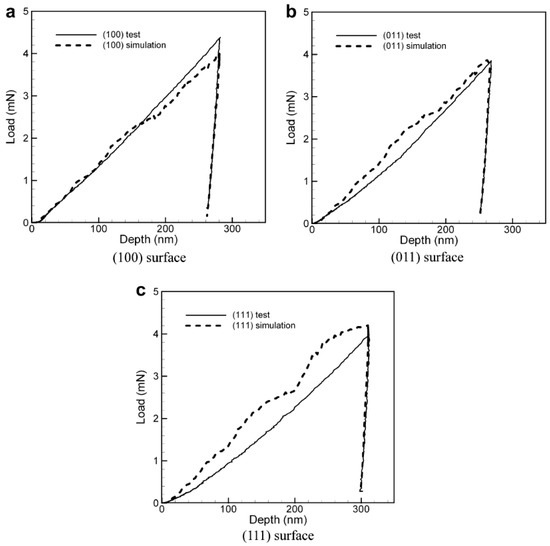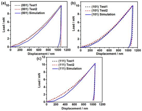 Figure 36. Comparisons between numerical and experimental load-displacement curves on copper samples of different crystallographic orientations made with a spherical indenter (tip radius 3.4 μm): (a) (100) plane; (b) (011) plane and (c) (111) plane [133]. Reproduced with permission from Y. Liu et al., International Journal of Plasticity; published by Elsevier, 2008.