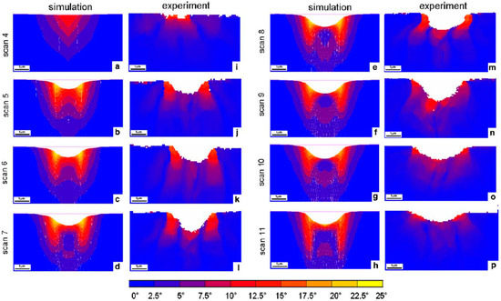 Figure 37. Rotation maps for a set of successive (11 2 ¯ ) sections perpendicular to the (111) indentation plane (surface plane perpendicular to the plane presented) with different spacing to the actual indent [45]. The images on the left-hand side (ah) were obtained from viscoplastic crystal plasticity simulations. The corresponding maps on the right-hand side (ip) were determined via EBSD measurements in succeeding planes prepared by serial FIB sectioning. The color code shows the magnitude of the orientation change relative to the initial crystal orientation without indicating the rotation axis or rotation direction. Scaling is identical for all diagrams. Reproduced with permission from N. Zaafarani et al., Acta Materialia; published by Elsevier, 2006.