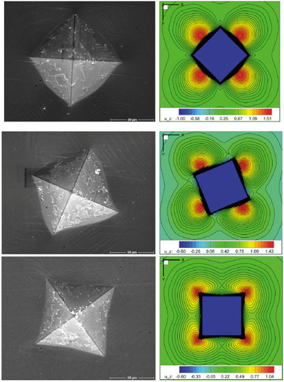 Figure 38. Pyramidal indentation experiments into (001) FCC CMSX-4. Left: experiment (SEM); right: simulation with isolines of height, uz (μm), for azimuthal orientation angle θ = 0°, 22.5°, 45° in row 1–3. In the coordinate system, X-, Y-, Z-axes each represent h001i directions. The white stains in the experimental indentation craters are debris from sputtering [135]. Reproduced with permission from Y. Liu et al., International Journal of Plasticity; published by Elsevier, 2008.
