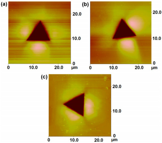 Figure 40. Atomic-force microscopy (AFM) images of the indent impressions made on a single-crystal Al workpiece with a Berkovich indenter (tip radius 200 nm) at different crystallographic orientations: (a) (001), (b) (101) and (c) (111) surfaces [136].