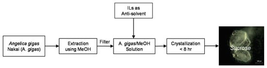 Pulverized dried roots of A. gigas (300 mg) and 5 mL of MeOH were placed in a 20 mL vial. Thereafter, the system was agitated at 200 rpm and 25 °C for 1 h. Afterwards, the methanol extract was vacuum filtered and the filtrate was collected. Several samples of the MeOH extract of A. gigas (3 mL each) were prepared for the following process. Subsequently, anti-solvents, including ILs BMImBF4, BMImPF6, BMImTFSI, AEImBF4, and AAImBF4, and organic solvents n-hexane, methylene chloride, acetone, and acetonitrile, were individually added to samples at different volumes of 3, 6, and 9 mL (extract solution/anti-solvent ratios 1:1, 1:2, 1:3 (v/v)). Each mixture was stirred at 25 °C and 100 rpm for three days, maximum, then filtered to collect the crystals. As a result, when the organic solvents were used as anti-solvents, no crystals were obtained even after three days of the experiment. However, crystals were educed within less than 8 h with ILs as anti-solvents. Afterwards, produced crystals were subjected to vacuum filtration and were washed with 5 mL of MeOH three times while being filtered. The collected crystals were analyzed by means of 1H-NMR, SXD, and video-microscope and were confirmed to be single crystals of sucrose molecules. Accordingly, the experiment process chart has been suggested in Figure 1.