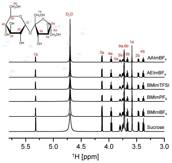 1H-NMR spectrum of sucrose crystals precipitated from the MeOH extraction solution of A. gigas when utilizing ILs as anti-solvent (A. gigas extraction solution/ILs: 3 mL/3 mL (1:1 v/v), solvent: D2O).
