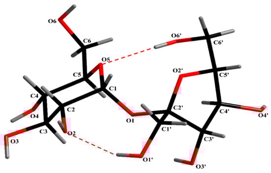 Therefore, we could forecast that sucrose crystals isolated from A. gigas when ILs were used as the anti-solvent have identic crystal structure as the previously-reported sucrose crystals. For more specific analysis with regard to SXD analysis results, the crystal packing structure of sucrose crystals educed by BMImBF4 was studied. The molecule conformation structure of sucrose crystals made with BMImBF4 is depicted in Figure 3. According to the molecular structure data, the conformation and the packing of sucrose molecules were perceived and the crystal structure could be achieved.