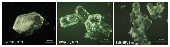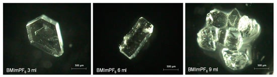 The morphology of sucrose crystals educed from the MeOH extract of A. gigas at different A. gigas extraction solution/ILs (v/v) ratios was monitored by means of video microscope (300×). According to the result, the change in crystal morphology was observed with the variation of the type and the concentration of ILs. Additionally, these sucrose crystals were found to possess distinct morphologies compared with the currently-marketed sucrose crystals, which have large rectangular shapes (Figure S1). In Figure 5 the images of the sucrose crystal morphologies obtained according the BMImBF4 concentration variation are illustrated. When 3 mL of BMImBF4 (A. gigas extract solution/BMImBF4 (1:1 (v/v)) was used, the sucrose crystals were long and hexagon-shaped. However, at 6 mL (A. gigas extract solution/BMImBF4 (1:2 (v/v)) and 9 mL (A. gigas extraction solution/BMImBF4 (1:3 (v/v)) BMImBF4 composition, long, rectangular-shaped sucrose crystals were produced. Further, it was confirmed that all sucrose crystals possessed identic PXRD patterns regardless of the concentration of BMImBF4 (Figure S2).