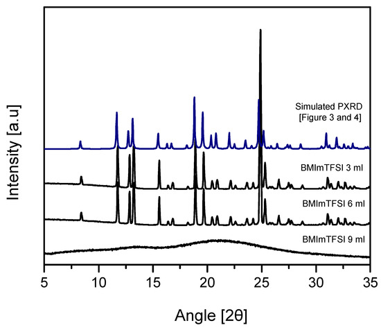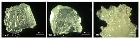 Sucrose crystals precipitated using BMImTFSI presented different crystal morphologies and PXRD patterns compared to the others. Figure 7 illustrates various morphologies of sucrose crystals precipitated under BMImTFSI concentration change. As a result, under BMImTFSI 3 mL and 6 mL (A. gigas extraction solution/BMImTFSI (1:1 (v/v)) and (1:2 (v/v)) conditions, sucrose crystals were characterized by a large, rectangular-shaped crystals with small, rectangular-shaped crystals formed on the surface due to the secondary nucleation and growth phenomenon [38]. However, crystals obtained with BMImTFSI 9 mL (A. gigas extraction solution/BMImTFSI (1:3 (v/v)) were confirmed to be amorphous sucrose crystals. Moreover, identical patterns of PXRD were observed for the sucrose crystals obtained at 3 mL and 6 mL of BMImTFSI and those at BMImBF4 and BMImPF6. However, sucrose crystals precipitated from 9 mL of BMImTFSI were confirmed to be amorphous according to the PXRD patterns (Figure 8). Also, DSC curves with onset temperature at approximately 182 °C and endothermic temperature at 191 °C was recorded for sucrose crystals obtained from BMImTFSI 3 mL and 6 mL (DSC experiment conditions: heating rate: 10 °C/min and the temperature range set from 30 °C to 230 °C). Nevertheless, neither endothermic nor exothermic peaks could be observed from the DSC curve of sucrose crystals precipitated from BMImTFSI 9 mL (Figure S5). Therefore, these sucrose crystals were confirmed as amorphous materials. The precipitation of amorphous material is assumed to be a result of the provocation of a rapid increase in supersaturation level by addition of a large amount of BMImTFSI which led to the consequent production of amorphous sucrose. Further, the simulated PXRD patterns and analytical PXRD patterns of sucrose crystals precipitated from ILs were found to be identical (Figure 8).