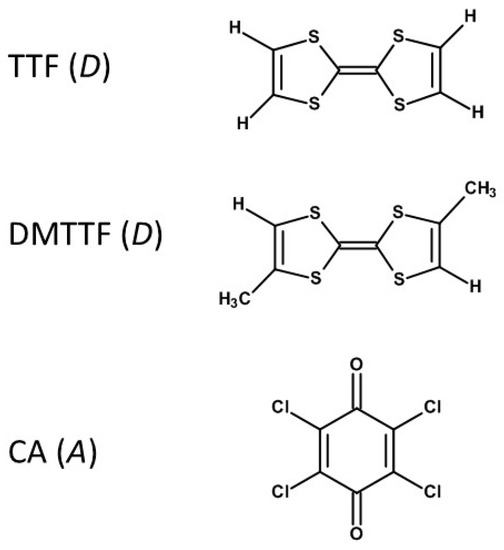Chemical forms of the donor and the acceptor molecules for the two DA compounds discussed in detail in this review: TTF tetrathiafulvalene, DMTTF dimethyltetrathiafulvalene and CA p-chloranil.