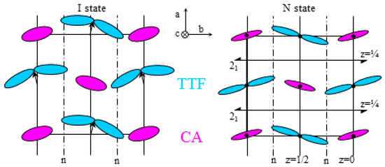 Finally, we would like to mention two intriguing situations in compounds not close to TTF-CA. Thus, the (BEDT-TCNQ)-(ClMe-TCNQ) presents a neutral-to ionic phase transition only under pressure [64] and where the space group P21 of the N phase is already non-centrosymmetric. It is a chiral and polar group, with a polarization parallel to the screw axis 21. Crossing the transition under pressure gives rise to a symmetry breaking with the establishment of the space group P1. The second case concerns a metal-complex-based covalently bonded DA chain compound, beyond stacked π-DA charge transfer systems. It presents stepwise N-I phase transitions [65], with an intermediate phase between a high temperature N phase fully neutral with and a low-temperature I phase fully ionic, in the temperature range 210 K < T < 270 K. This phase is characterized by an average ionicity of about 1/2 and a long range ordering between N and I chains, in relation with the appearance of superstructure reflections.