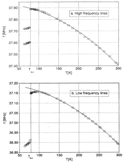 Temperature dependence of the high-(a) and low-(b) frequency chlorine NQR lines in TTF-CA. From Reference [24,25] with permission. Copyright 1993 American Physical Society.