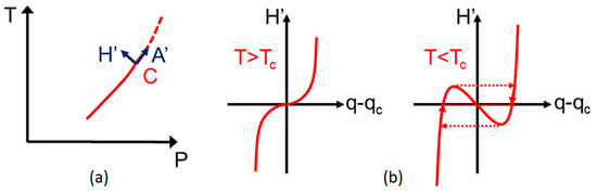 The curve q(H’), resulting from the equation of state H’ = A’(q − qc) + B'(q − qc)3, is monotonous for A’ > 0 with an inflection point at H’ = 0 and becomes S-shaped for A’ < 0, (Figure 5). It should be underlined that this S-shaped behavior is the fingerprint of a positive feedback mechanism (cooperative action) describing a bistable regime. This is known for the thermal evolution of a set of spin crossover molecules coupled by cooperative elastic interactions [32]. This is also observed for the N-I models discussed in [14,34], in particular the toy model which describes the quantum ground state of a set of DA dimers coupled via cooperative Coulomb interactions.