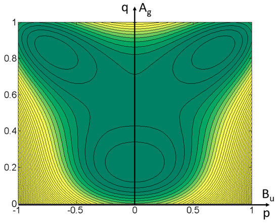 In addition to the trivial solution p = 0, the Equation (4) exhibits two equivalent non-zero solutions ± p only if A + λ(q − qc) + µq(1 − q) is < 0. Thus, if the term λ(q − qc) is sufficiently dominant, the emergence of the symmetry breaking requires a sufficiently large “ionicity”, which is effective in I state. This is consistent with the existence of a region in the control parameter space (P-T), where multistability occurs with the presence of three minima: on the one hand a paraelectric N phase with q < qc and p = 0, on the other hand two equivalent ferroelectric I phases with q > qc and ± p ≠ 0. The energy gain provided by the ferroelectric ordering in the I state pushes the N-I boundary at higher temperature with respect of the simple isostructural case. Given the large number of parameters, numerical calculations for a chosen set of parameters allow to visualize the thermodynamic potential landscape (Figure 6). This multistable regime takes place in a 2D order parameter space, which is fundamentally different from the well-known triple-well picture in a 1D order parameter space used for describing a symmetry breaking first-order phase transition when B < 0 (Appendix A). It is similar to the one discussed in term of potential energy surface for the ground state of a modified Hubbard model of a mixed DA stack [37], but also in terms of free energy for a simplified model [38]. A similar situation exists in another ferroelectric system, Sn2P2S6, and with the same lowering of symmetry as TTF-CA, from P21/n to Pn [39]. It has been discussed in term of a strong linear-quadratic interaction between a zone-center fully symmetrical Ag structural distortion and a polar Bu one. In addition, significant coupling between the ferroelectric order parameter and strain is pointed out. As discussed in Appendix A, a coupling term between the totally symmetric strain tensor, describing the volume change, and the ferroelectric order parameter is linear-quadratic by symmetry. This can lead to an evolution of the strain proportional to the square of the order parameter. However, with regard to the essential role of the isostructural change within the N-I transition, a bilinear coupling term between the totally symmetric strain tensor and the totally symmetric order parameter has also to be taken into account.