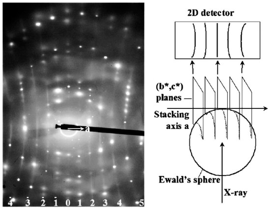 Diffuse planes observed at TNI + 2K (left). The stacking axis a is horizontal and the projections of the intersection of (b*,c*) planes with the Ewald sphere correspond to the diffuse curves (right). From Reference [11] with permission. Copyright 2006 American Physical Society.