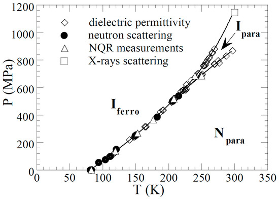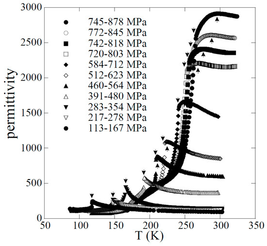 Additional features have been obtained from dielectric measurements under pressure. Complex permittivity studies were performed in a frequency range from 1 kHz to 13 MHz in a temperature range from 80 to 300 K and under pressure up to 1 GPa, which allows to complete the phase diagram toward higher pressure. Helium was always the pressure-transmitting medium, but here the pressure losses are not compensated, yielding a pressure variation when the temperature changes (Figure 13). Previous measurements [100] have reported an anomalous dielectric response for an electric field parallel to the stacking axis a. A remarkable increase of the dielectric response has been observed with decreasing temperature in the N phase at ambient pressure. The results were interpreted in terms of the dynamics of NI domain walls. However, due to significant conductivity effects, the interpretation remains difficult, even more when pressure increases at room temperature. This is why our dielectric permittivity measurements are presented in Figure 13 at high frequency (13 MHz) in order to reduce the low-frequency conductivity effects. We can already observe the effect of a measurement at high frequency when we compare our results at low pressure with the previous ones performed at lower frequency. As in [100], the dielectric response in the paraelectric state is much larger, by a factor of about 30–40, for electric field directed along the stack rather than for a perpendicular direction. The response strongly increases with increasing pressure. For lower pressure a divergence-like increase is observed when cooling down to the ferroelectric transition, with a clear first-order jump of dielectric permittivity at the transition. Above about 500 MPa, this divergent-like behavior is substituted on the paraelectric side by a maximum which moves away from the ferroelectric transition (jump), and more and more with increasing pressure. The position of this maximum is not frequency dependent, implying that it is not associated with relaxor-like behavior. The ferroelectric phase transition and the permittivity maximum are well located in the continuity of the two anomalies observed by neutron diffraction and NQR measurements, completing the phase diagram toward higher pressure.
