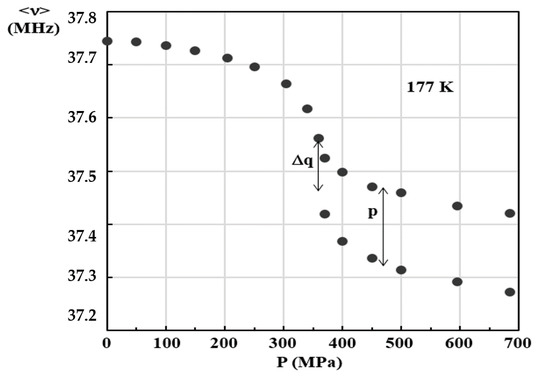 This intriguing behavior is even more evident if we consider NQR studies under pressure. One should remember that this local probe is sensitive to both the symmetry breaking and the totally symmetric change. Figure 2 in [8] presents the temperature evolution at 500 MPa and 685 MPa, while the pressure evolution at 177 K is presented in Figure 11. The difference of behavior with the one at atmospheric pressure (Figure 4) is obvious. When pressure increases, there is a clear tendency toward a continuous evolution around the transition of the NQR frequencies (average one in case of I doublet) which probes the totally symmetry change. On the contrary, the ferroelectric ordering, which is probed by the splitting due to the local loss of inversion center, always presents a discontinuity at the transition. When the pressure is sufficiently high, the main part of this (average) frequency evolution occurs for temperature above the one where the splitting jumps to zero. This is shown in Figure 12 through the temperature evolution for the high-frequency NQR line of the (average) frequency and the splitting as a function of temperature at two constant pressures. On the one hand, one can still observe, both at 500 MPa and at 685 MPa, a large jump of the splitting around respectively 201 K and 240 K. This phase transition, where the ferroelectric symmetry breaking occurs, remains clearly first-order. On the other hand, at 500 MPa a discontinuity in the evolution of the (average) frequency occurs at the same temperature 201 K, while at 685 MPa the main transitional part of the evolution of the frequency, superimposed to the standard thermal evolution, is observed above 240 K. Thus, the middle frequency of the transitional part is located at about 250 K. Two discontinuities occur successively at 240 K and 250 K, but their amplitude is difficult to determine precisely. Therefore, similarly to the neutron diffraction observation, the totally symmetric change takes place at higher temperature than the ferroelectric ordering beyond some pressure.