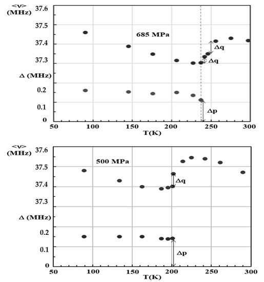 Temperature evolution of the (average) frequency and splitting for the high frequency NQR line at 500 MPa (bottom) and at 685 MPa (top). Adapted with permission from Reference [8]. Copyright 1997 American Physical Society.